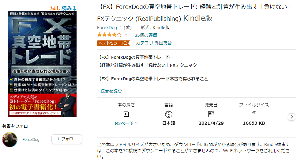 こちらは、ForexDog氏の手法の一部を抜粋したものをAmazonのKindleストアで販売している電子書籍となりますが、公開と同時に新着ランキング一位となり、その後、販売ランキングで「外国為替」「投資分析・販売戦略」の2部門でベストセラー1位を獲得し、さらに読者評価も★4.0という高評価を頂いております。